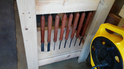 Safety first at Tortuga Early Instruments Worldwide Headquarters. And, in the interest of storage on my tiny shop while providing easy access, I put hooks on all of the lathe tools and hung them on complementary hooks installed into the lathe stand.